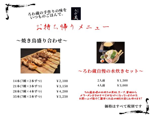 ろわ蔵お持ち帰りメニュー完成しました! »